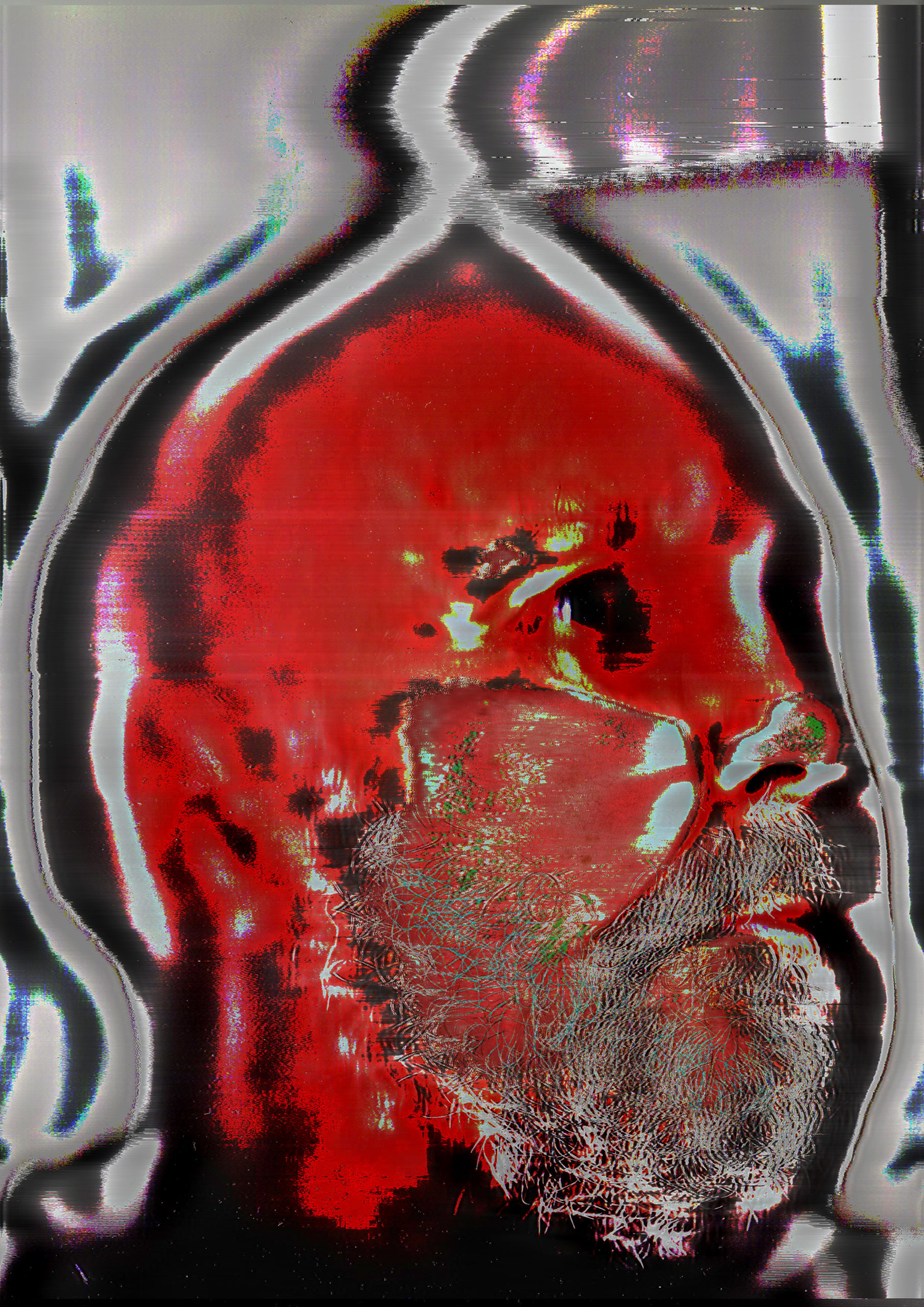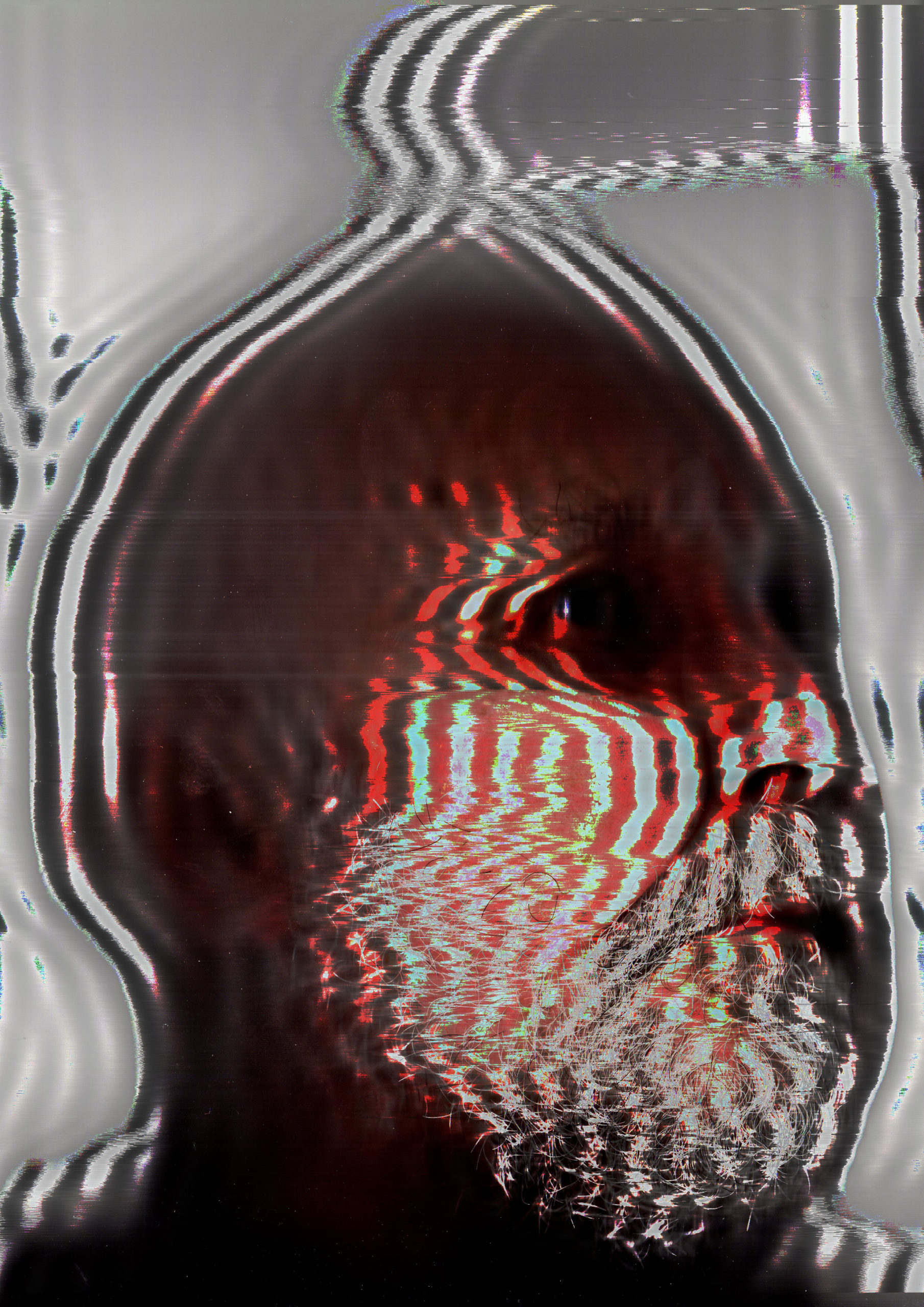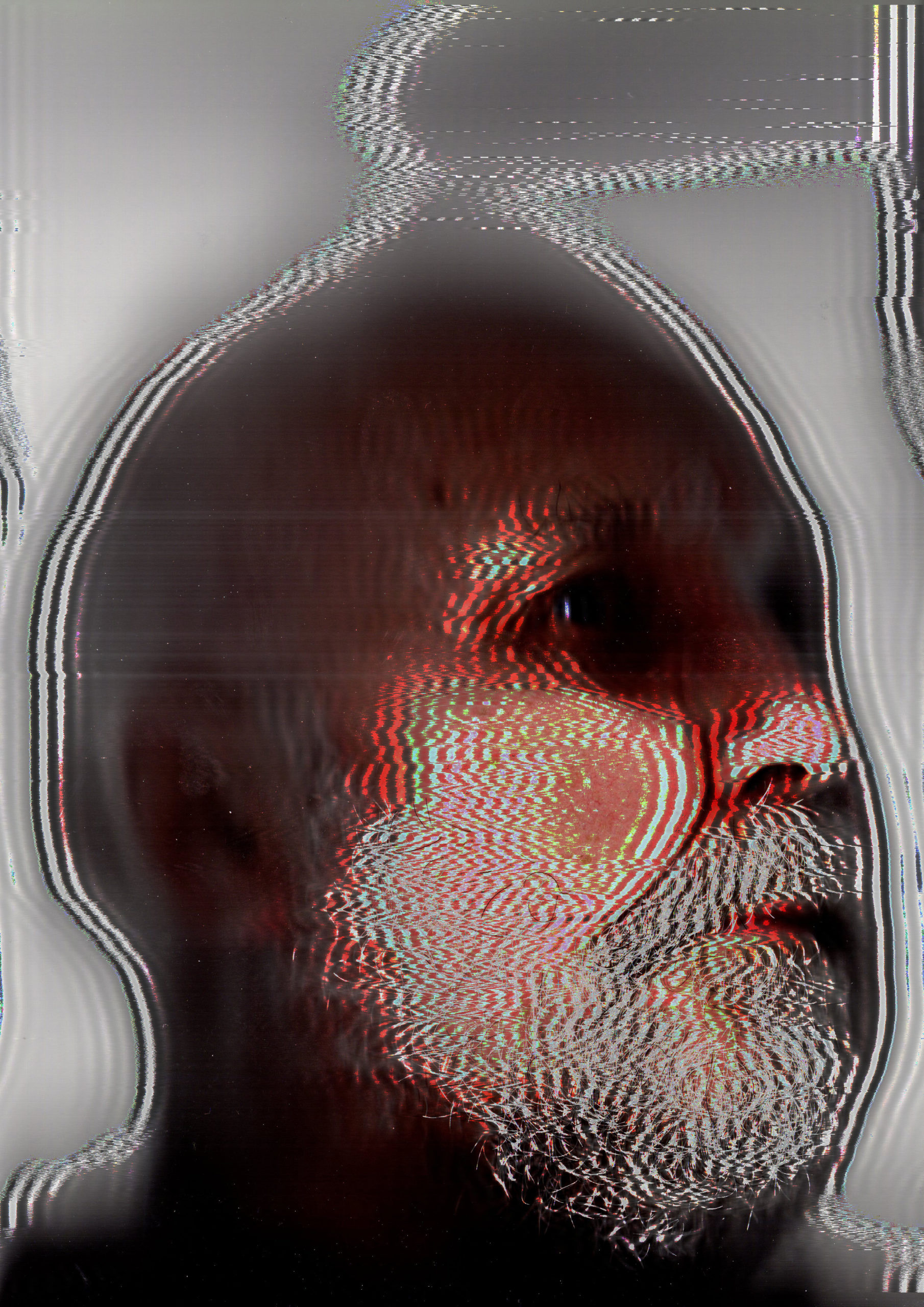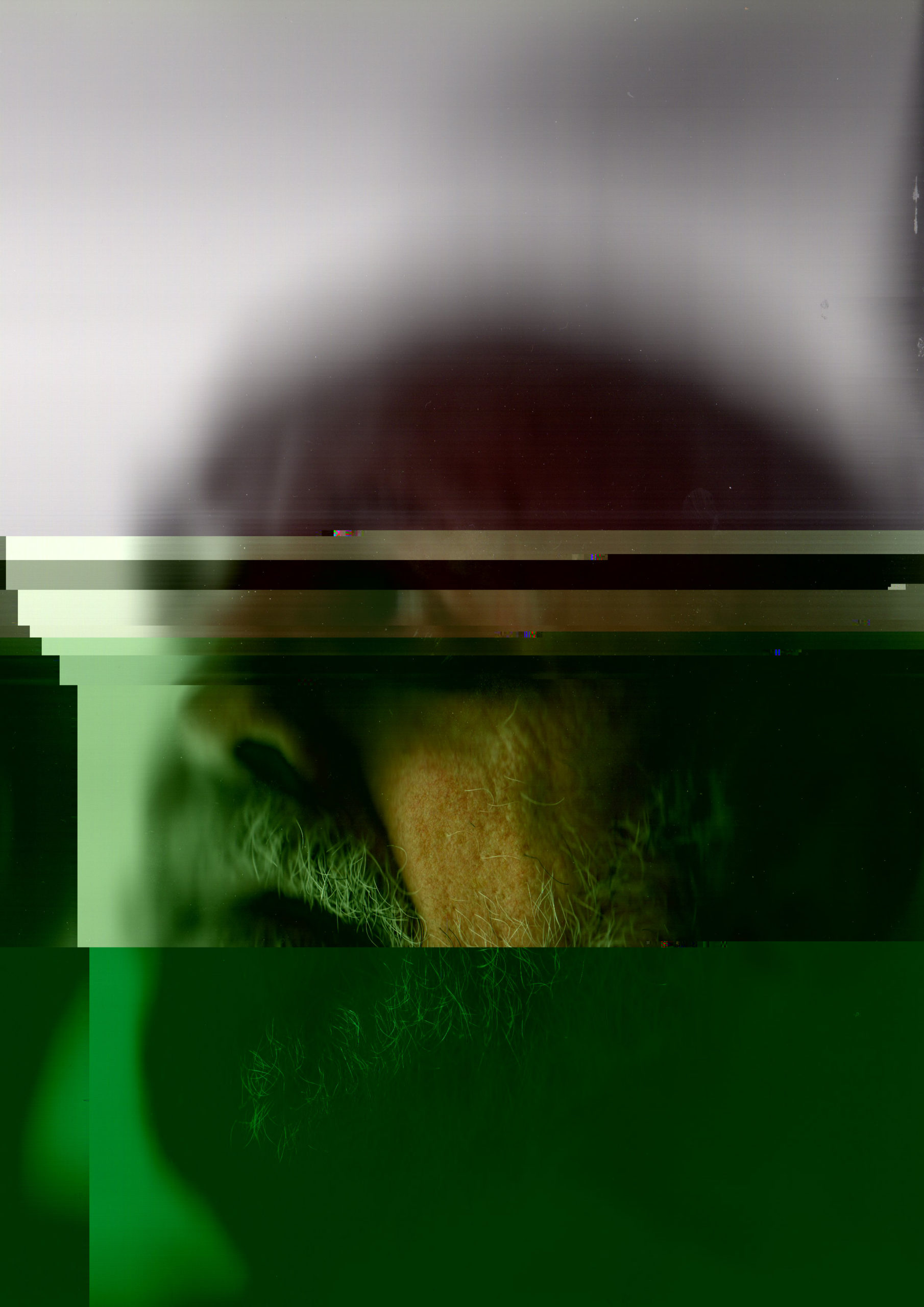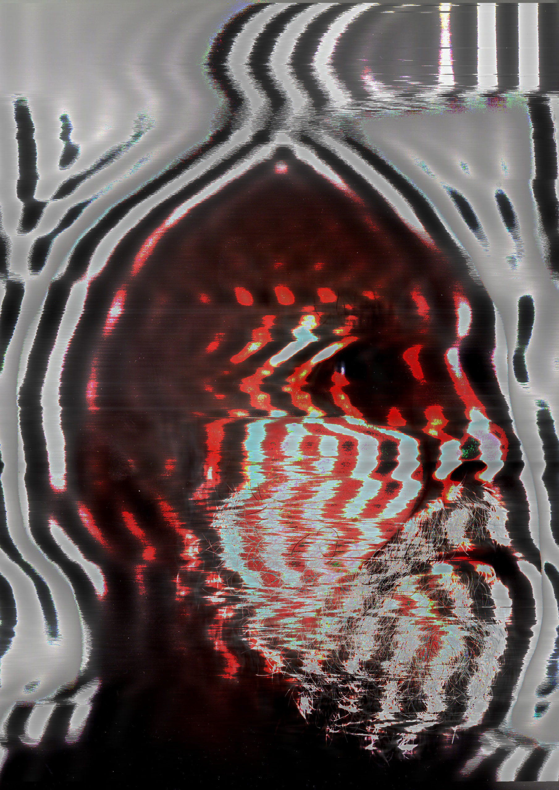 Dans un premier temps, j’ai repris quelques clichés issus de ma série sur l’autoportrait, « Unfolded Self-Portrait » pour les « glitcher » en introduisant aléatoirement des bugs dans les fichiers sources, et en déplaçant des morceaux de code. Puis, dans une deuxième série, j’ai ouvert les fichiers dans un logiciel de traitement du son (Audacity) et j’ai appliqué aux fichiers images des effets destinés aux sons : boucle, amplification, filtre passe-haut, réverbération, écho. Enfin, j’ai fait générer par une IA un visage entièrement artificiel que j’ai greffé sur un de mes autoportraits, créant ainsi une chimère hybride entre un visage humain et un visage entièrement simulé.