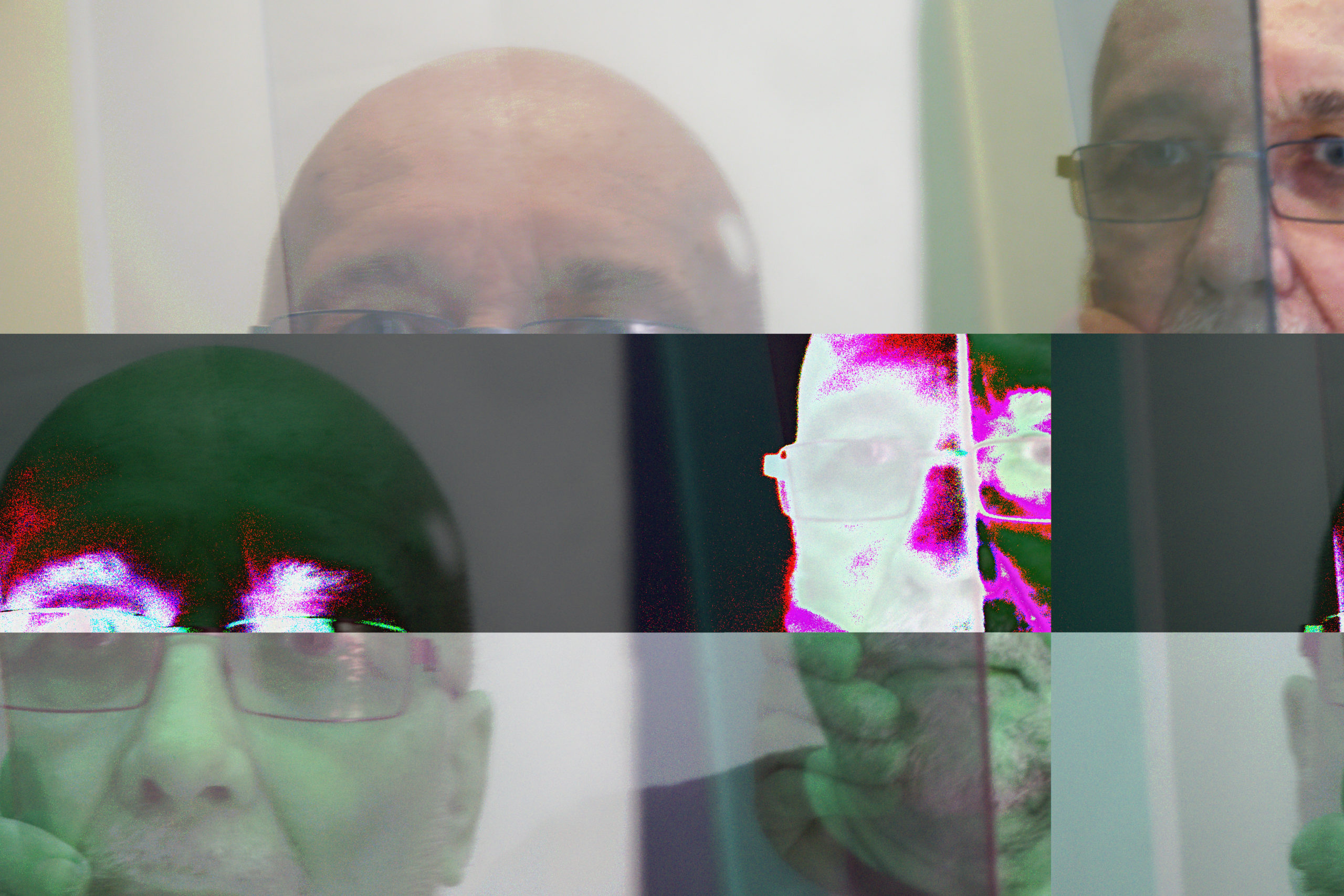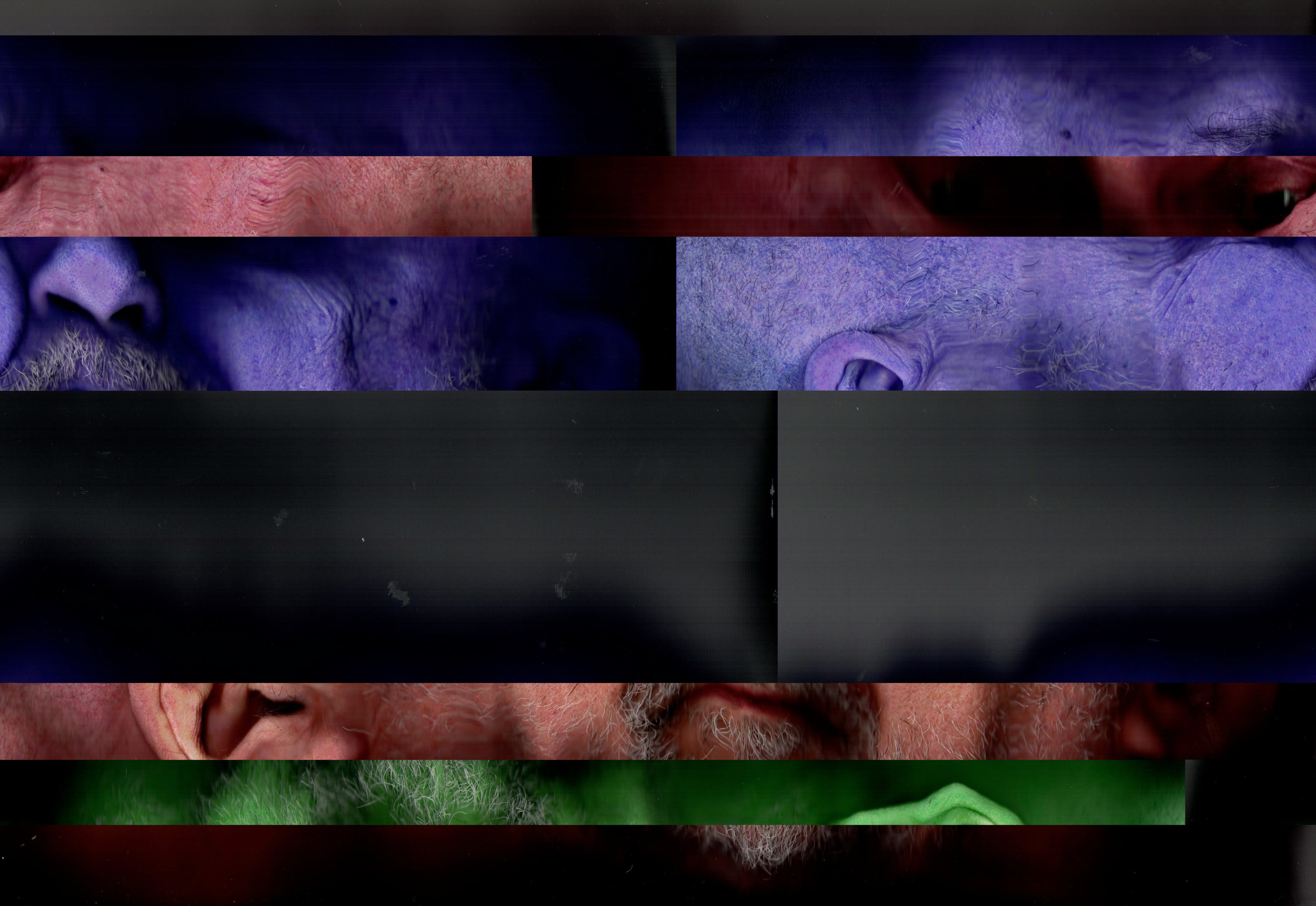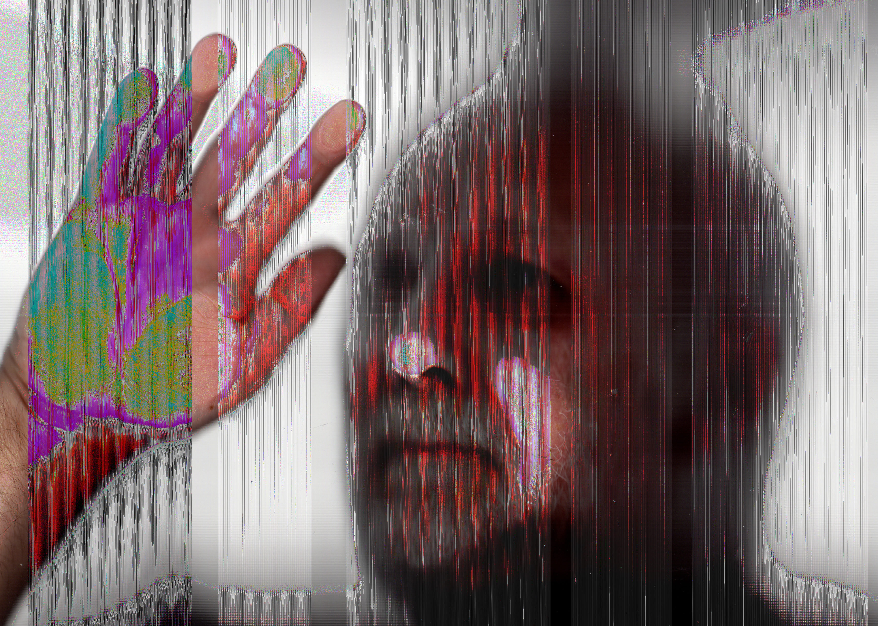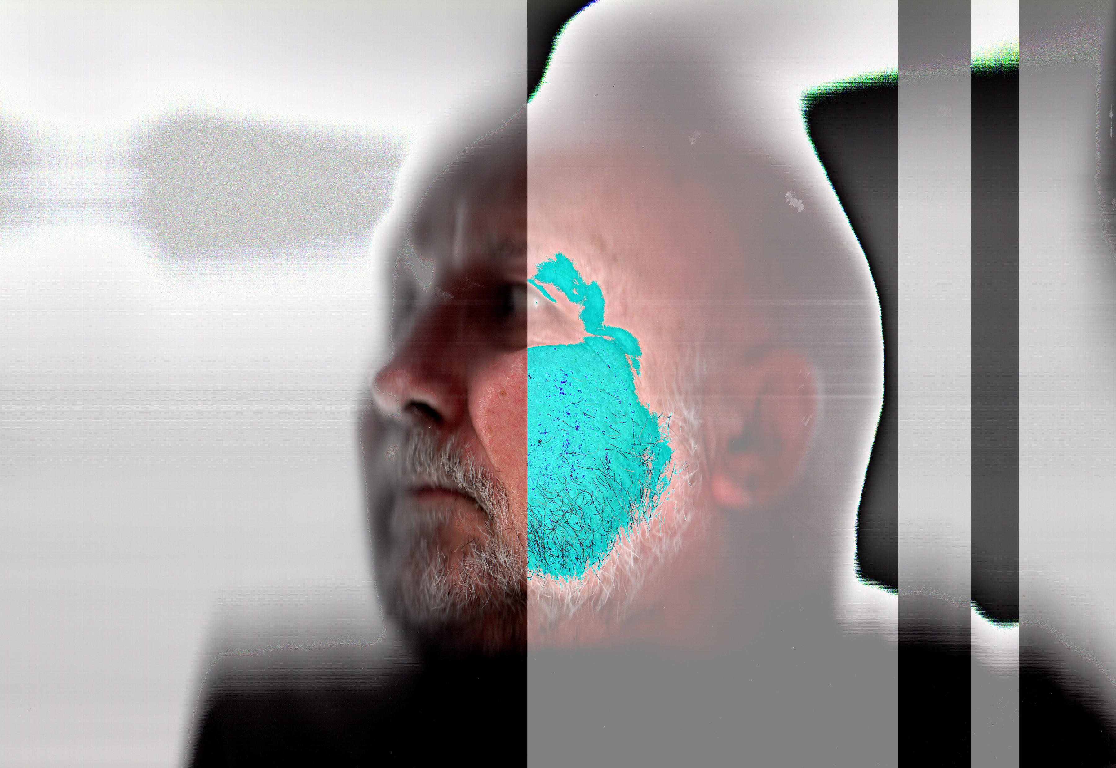 Dans un premier temps, j’ai repris quelques clichés issus de ma série sur l’autoportrait, « Unfolded Self-Portrait » pour les « glitcher » en introduisant aléatoirement des bugs dans les fichiers sources, et en déplaçant des morceaux de code. Puis, dans une deuxième série, j’ai ouvert les fichiers dans un logiciel de traitement du son (Audacity) et j’ai appliqué aux fichiers images des effets destinés aux sons : boucle, amplification, filtre passe-haut, réverbération, écho. Enfin, j’ai fait générer par une IA un visage entièrement artificiel que j’ai greffé sur un de mes autoportraits, créant ainsi une chimère hybride entre un visage humain et un visage entièrement simulé.