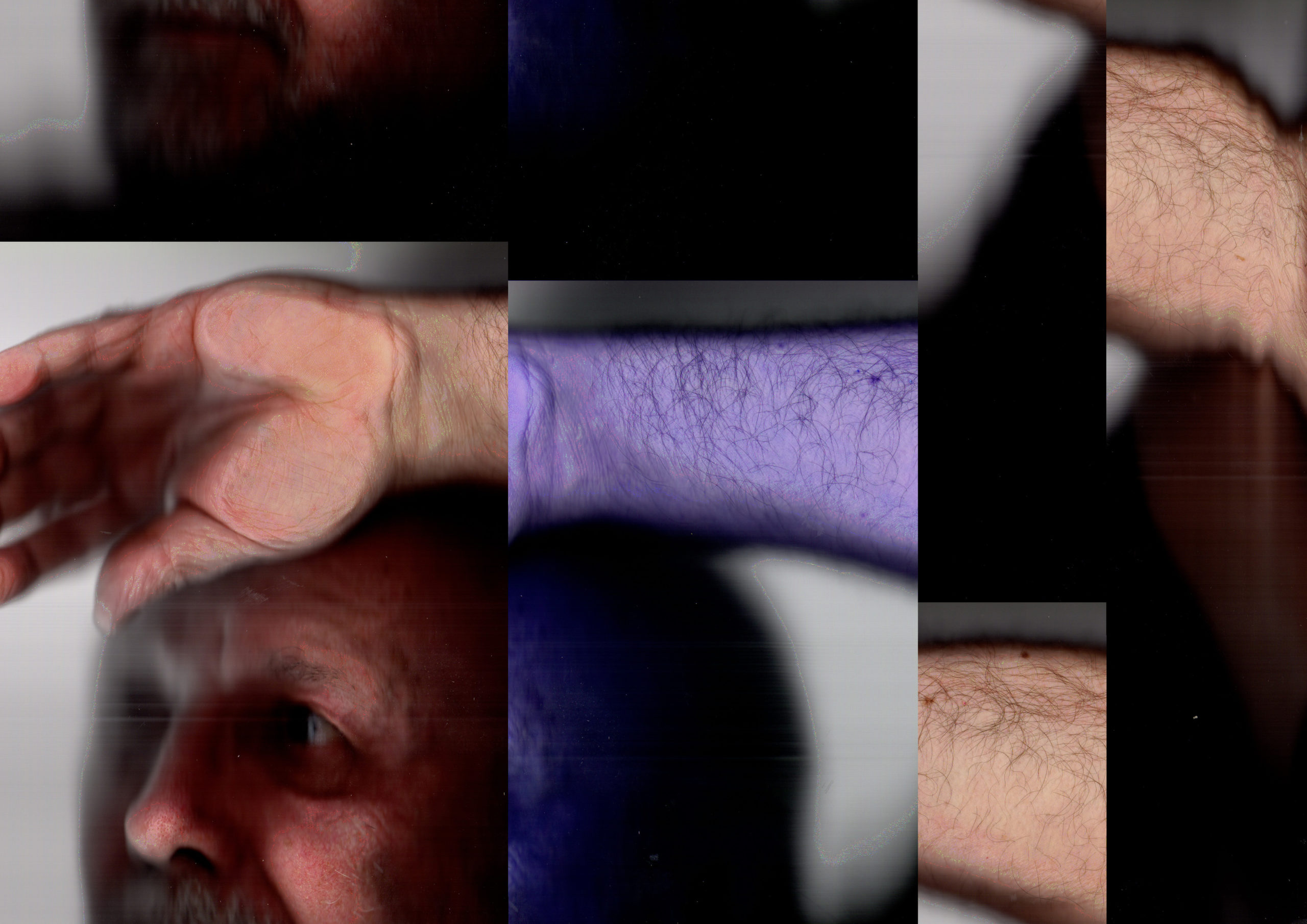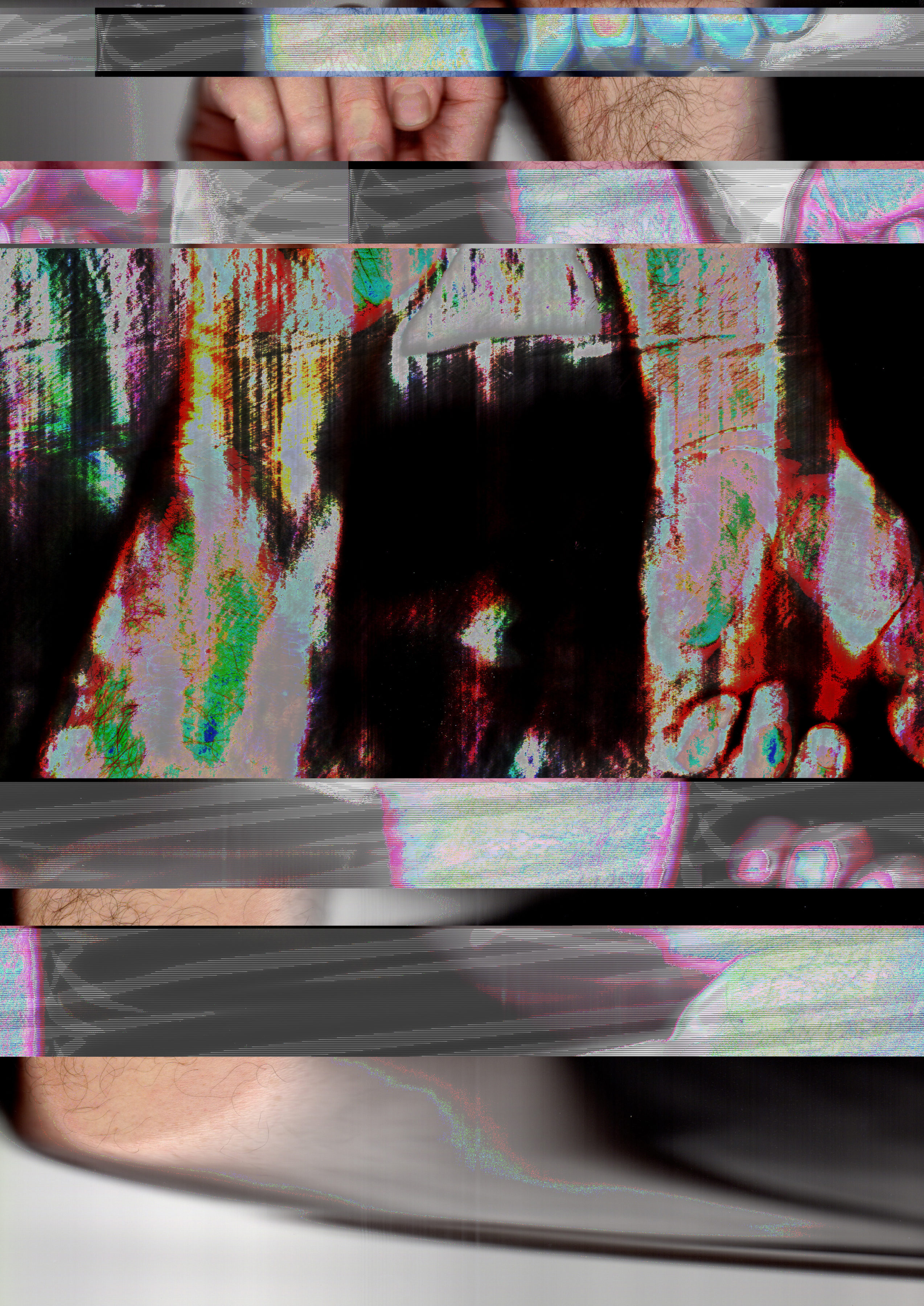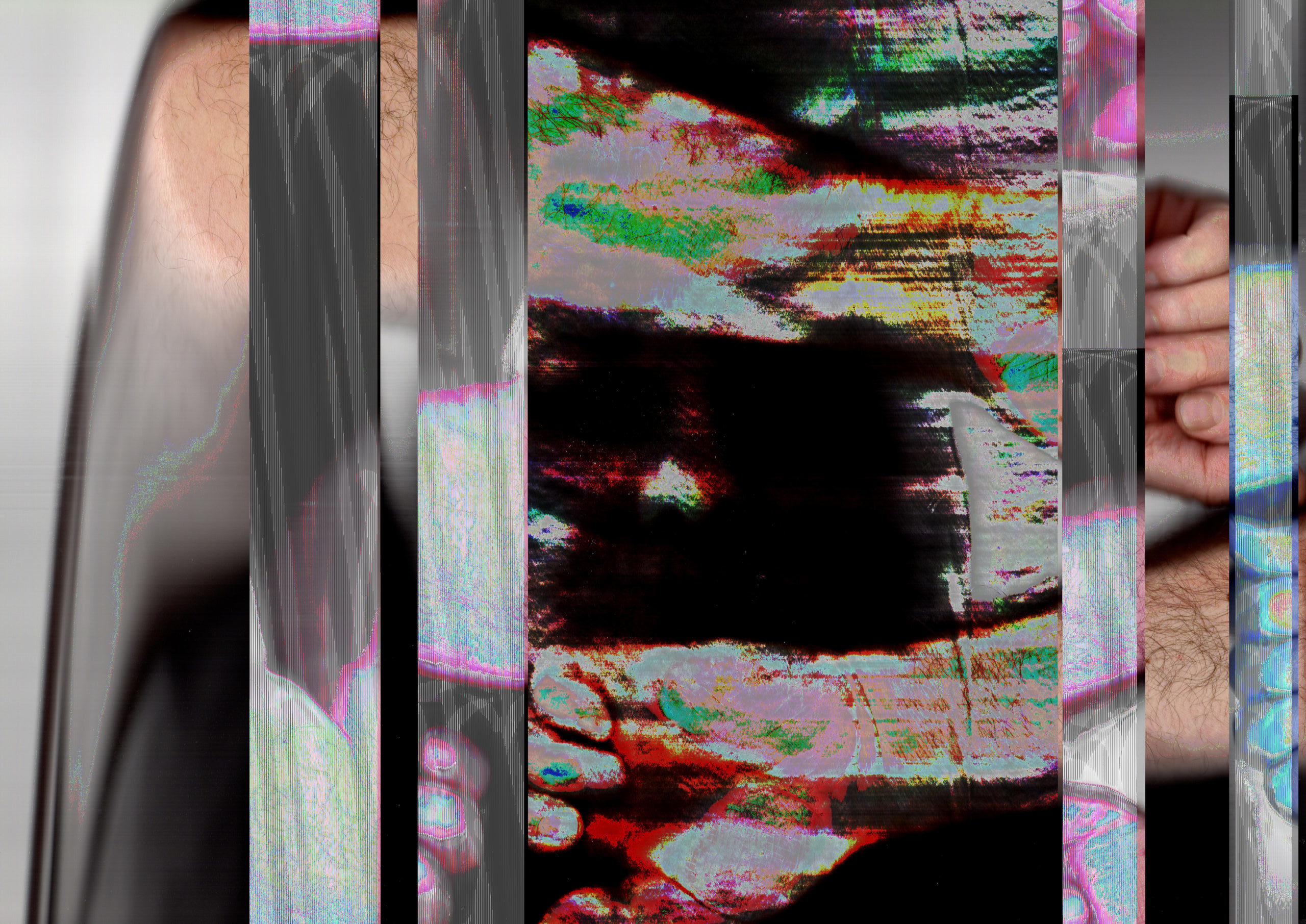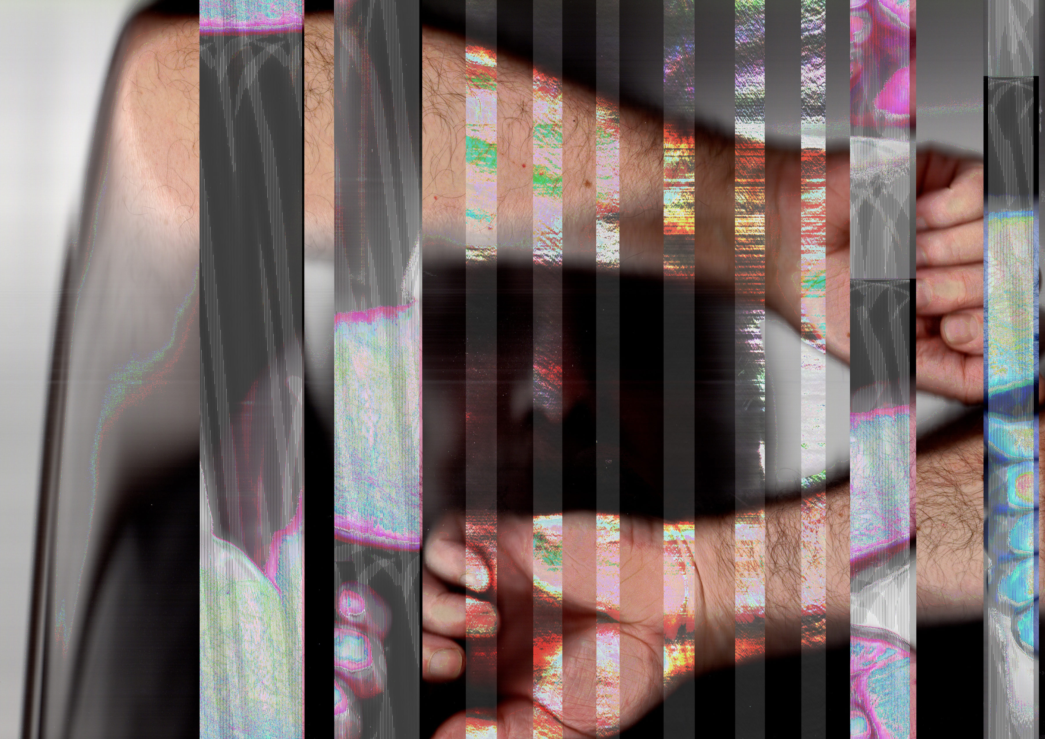 Dans un premier temps, j’ai repris quelques clichés issus de ma série sur l’autoportrait, « Unfolded Self-Portrait » pour les « glitcher » en introduisant aléatoirement des bugs dans les fichiers sources, et en déplaçant des morceaux de code. Puis, dans une deuxième série, j’ai ouvert les fichiers dans un logiciel de traitement du son (Audacity) et j’ai appliqué aux fichiers images des effets destinés aux sons : boucle, amplification, filtre passe-haut, réverbération, écho. Enfin, j’ai fait générer par une IA un visage entièrement artificiel que j’ai greffé sur un de mes autoportraits, créant ainsi une chimère hybride entre un visage humain et un visage entièrement simulé.