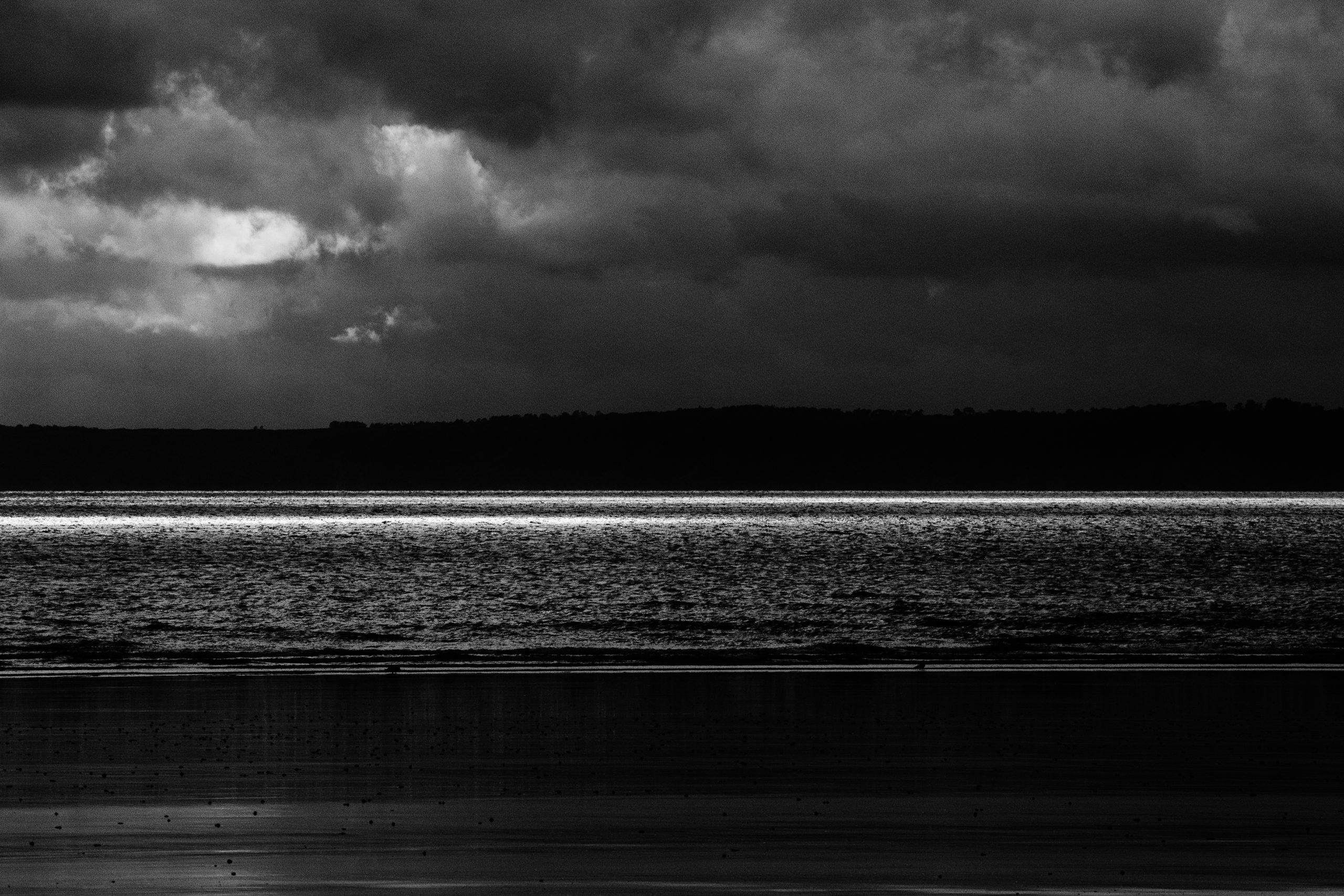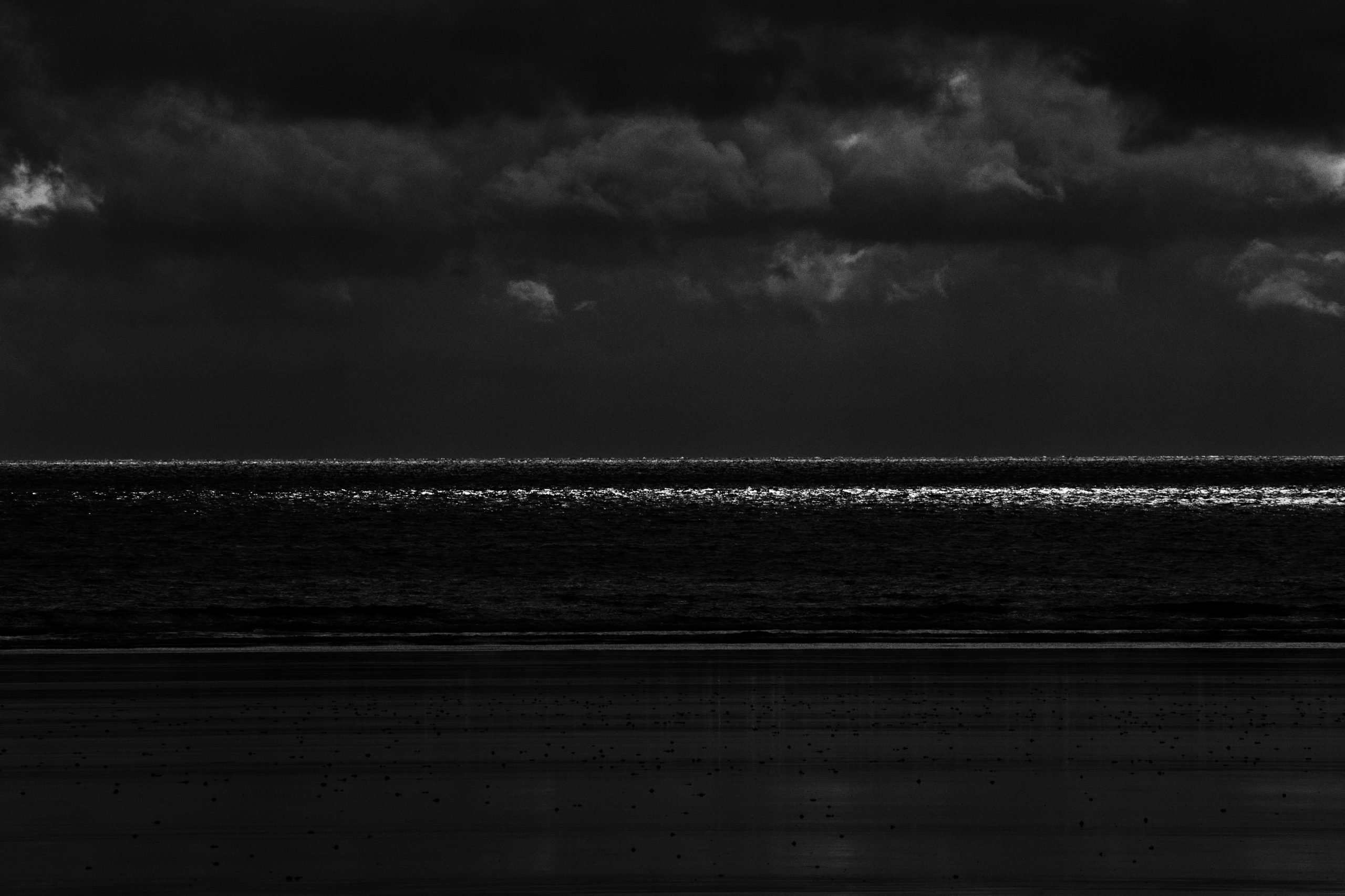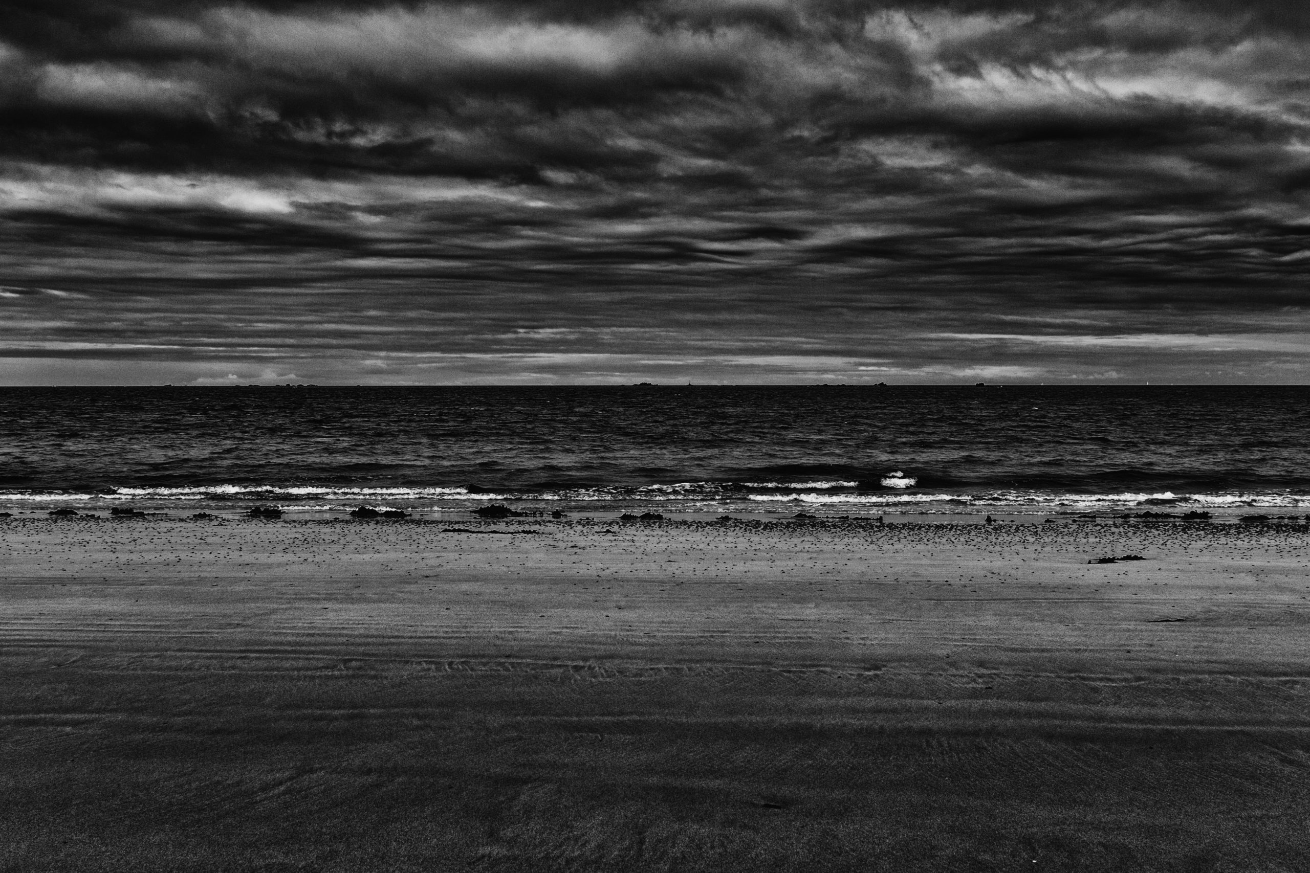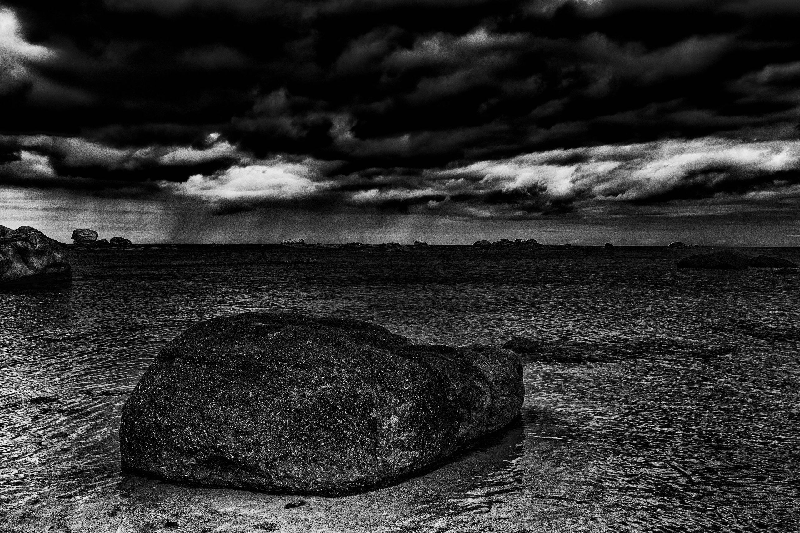 Orages sur la plage de Pentrez, baie de Douarnenez et rocher sur la plage de Kerlouan. Finistère. Baltique.