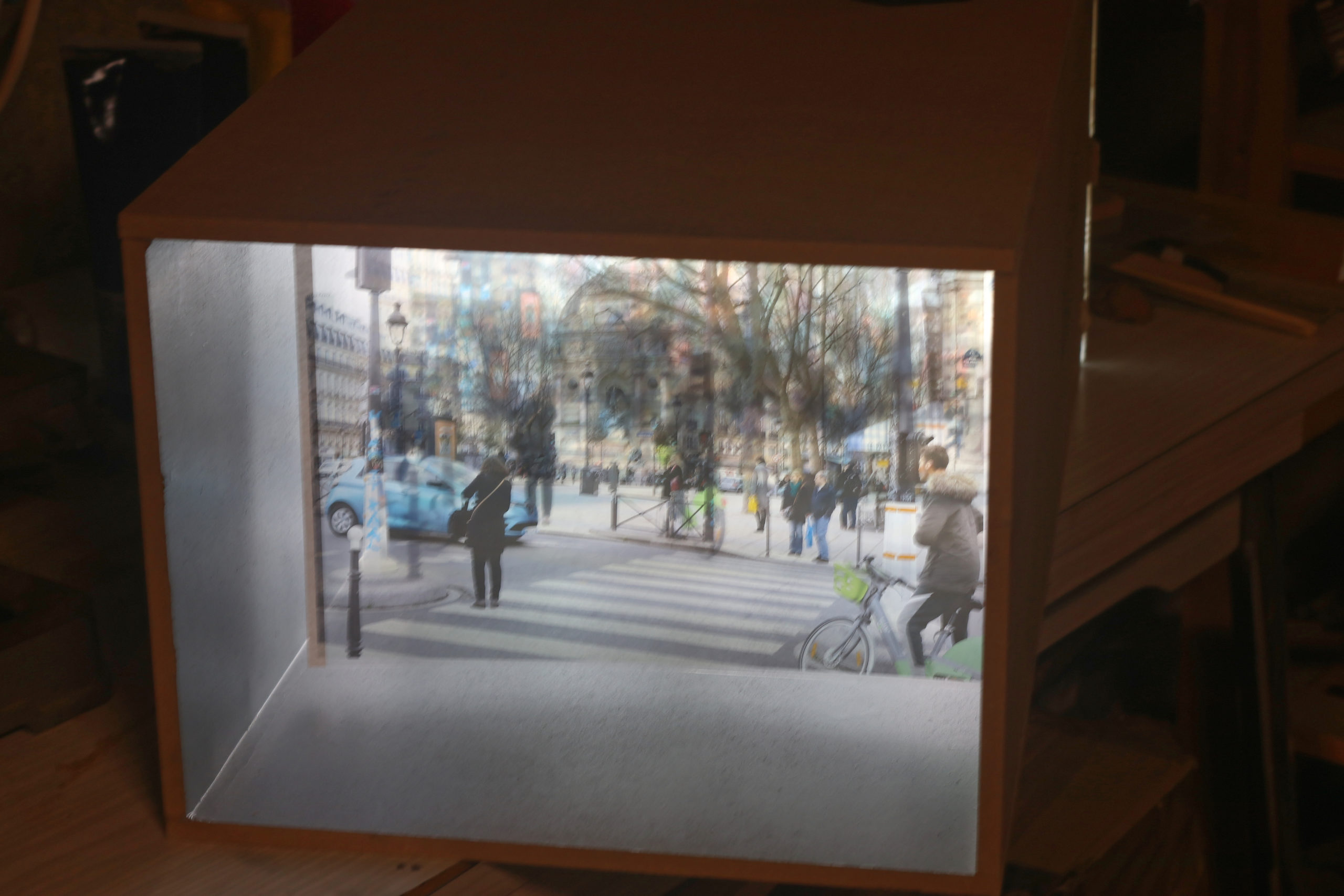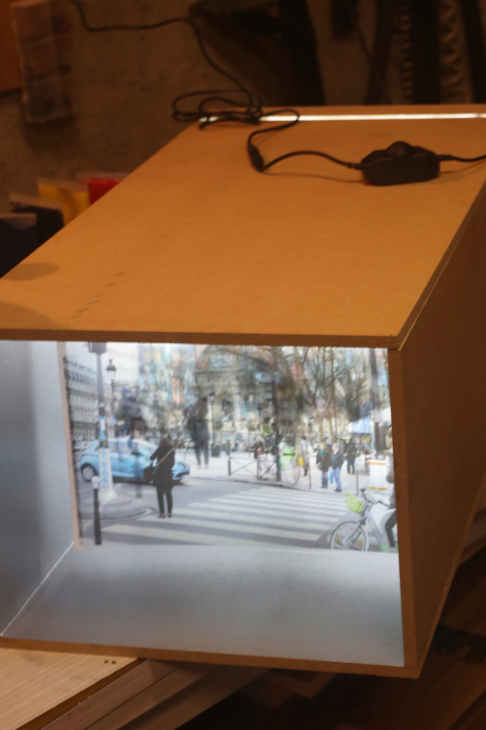 C’est en consultant cette page (vision alternative) que m’est venue l’idée de cette boite. J’ai imprimé sur du papier transparent des photos prises à des instants différents et les ai suspendues devant un écran lumineux. En faisant une gymnastique des yeux comme indiqué sur le site cité et en faisant un effort d’accommodation pour faire le point sur une image puis sur une autre, on pouvait faire comme si on rattrapait les photons du passé et ainsi voyager dans le temps.